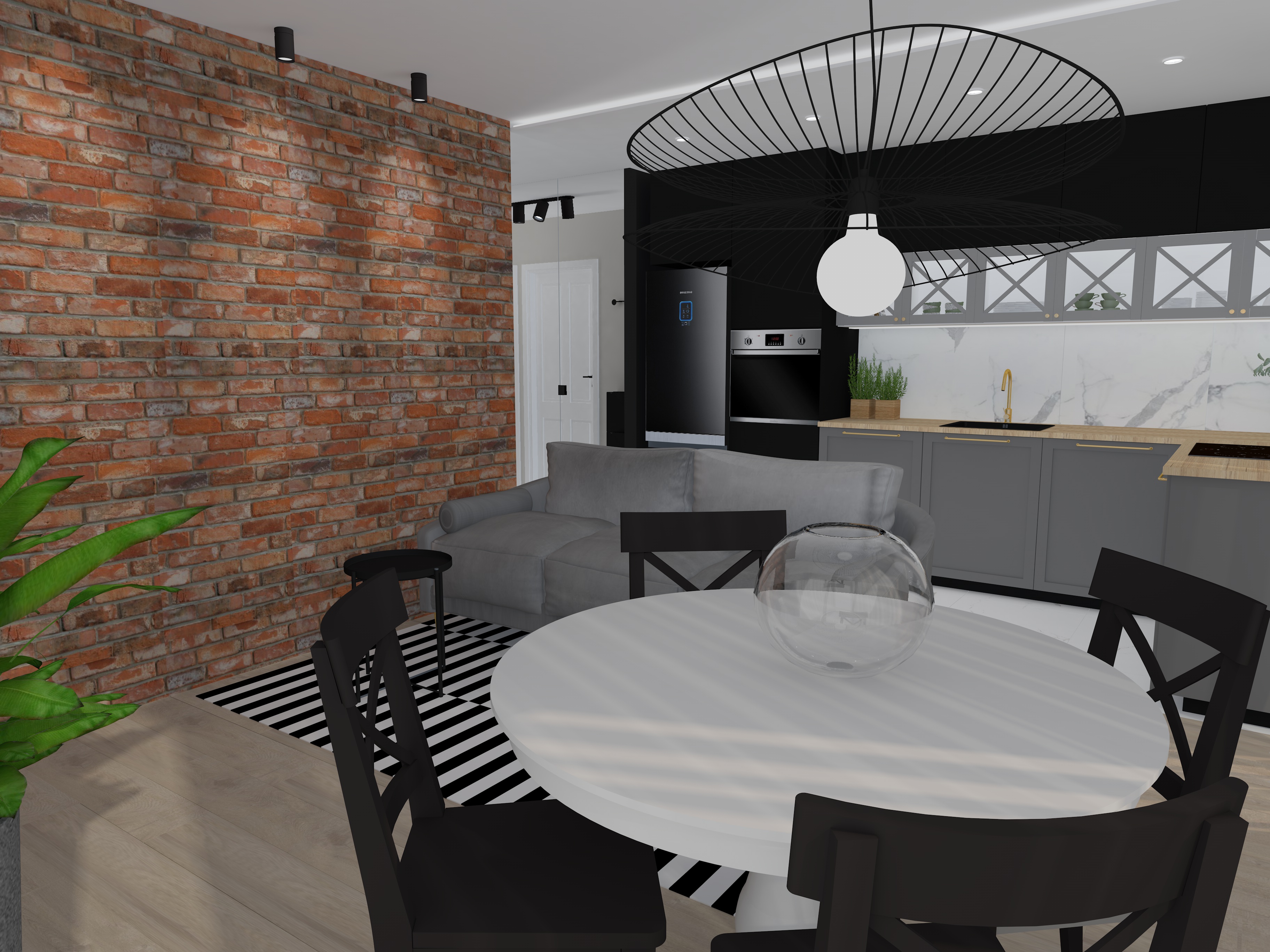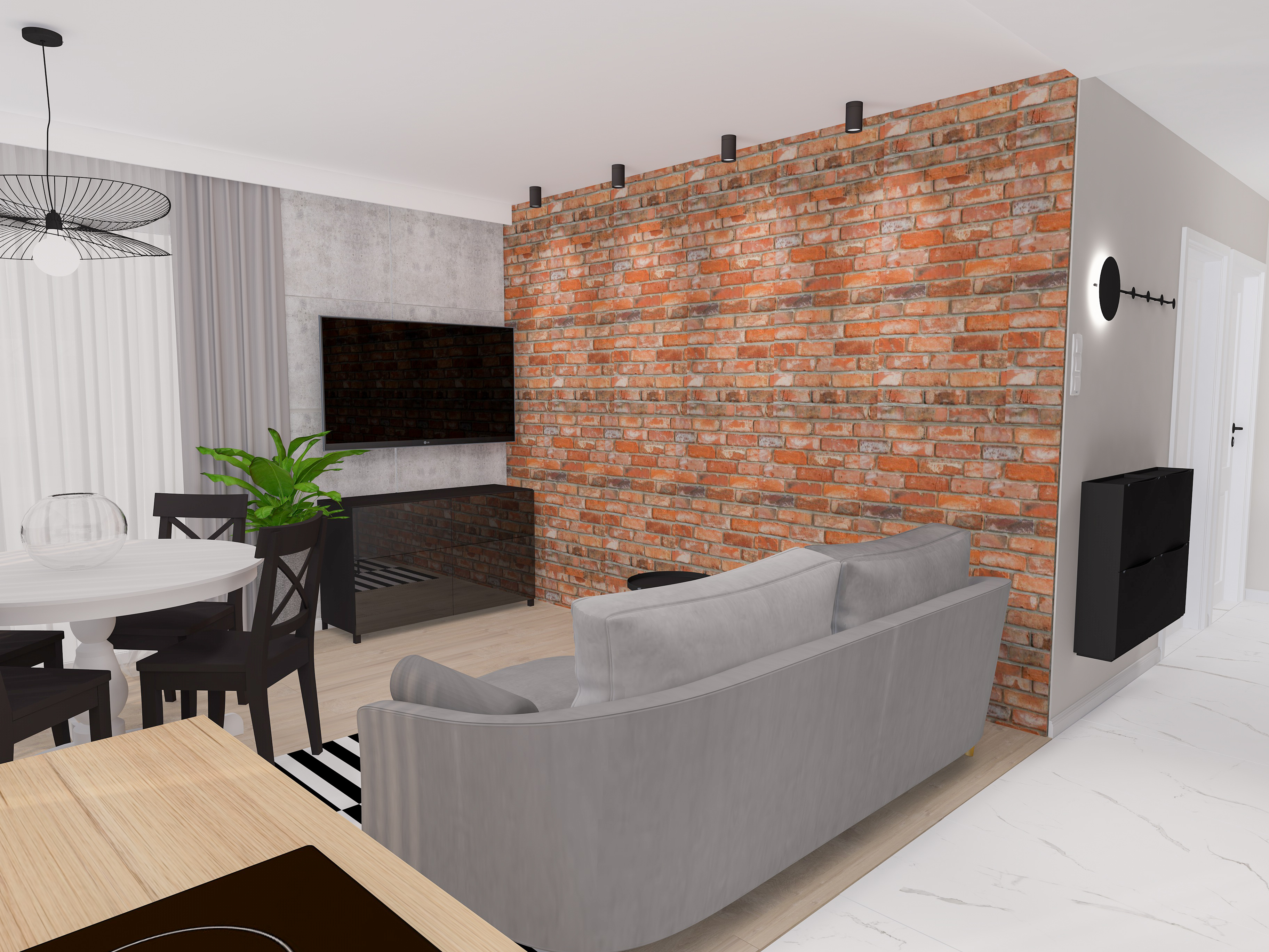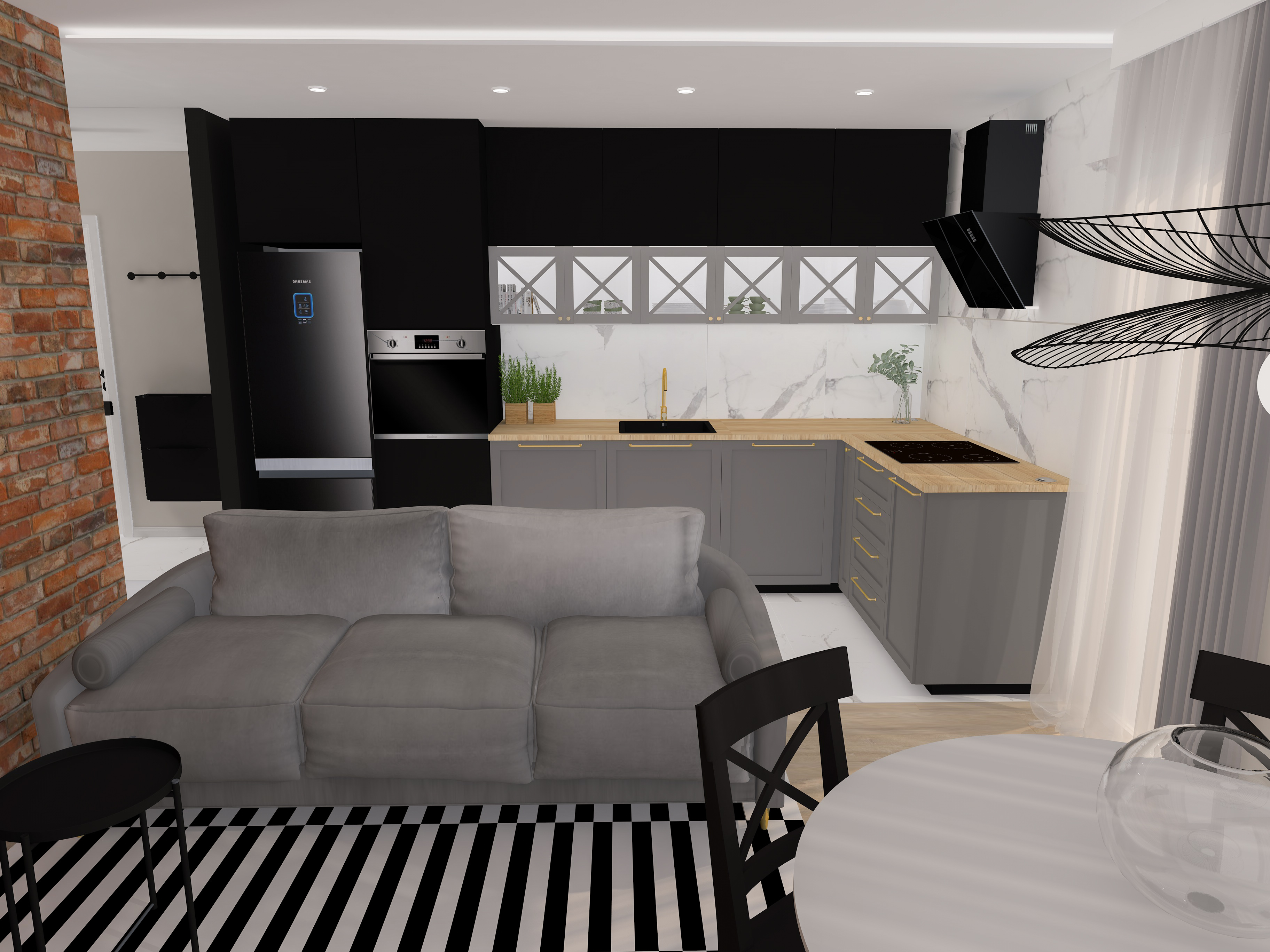 Moi klienci w dużej mierze zdali się na moje sugestie. Projekt wykonałam zdalnie bazując na rzutach, które dostałam. Taki układ salonu nie należy do najprostszych, ponieważ część salonu zajmuje kuchnia, a ściany zajmują duże okna. Trudno w takiej sytuacji wygospodarować odpowiednie miejsce na strefę telewizyjną i jadalnianą, ale na szczęście udało się:) Właściciele mieszkania marzyli o cegiełce, więc na jednej ze ścian umieściłam oświetloną cegłę. W kuchni postawiłam na gradient szarości i czerni skomponowane razem z płytkami imitującymi marmur. Żeby nadać kuchni elegancji zastosowałam złote uchwyty i kran. W jadalni zastosowałam okrągły stół. Uważam, że w niewielkim salonie właśnie taki stół jest idealnym rozwiązaniem. Stół ten ma możliwość rozłożenia więc sprawdzi się również podczas wizyty gości. Nad stołem jadalnianym zawiśnie delikatna, ale bardzo ozdobna lampa. Jeśli chodzi o strefę telewizyjną, na ścianie zaproponowałam betonowe płyty, a pod tv bardzo pojemną szafkę. Żeby ocieplić ten industrialny styl do całości dopasowałam przepiękną, rozkładaną, welurową sofę. Na wizualizacji prezentuje się to tak: