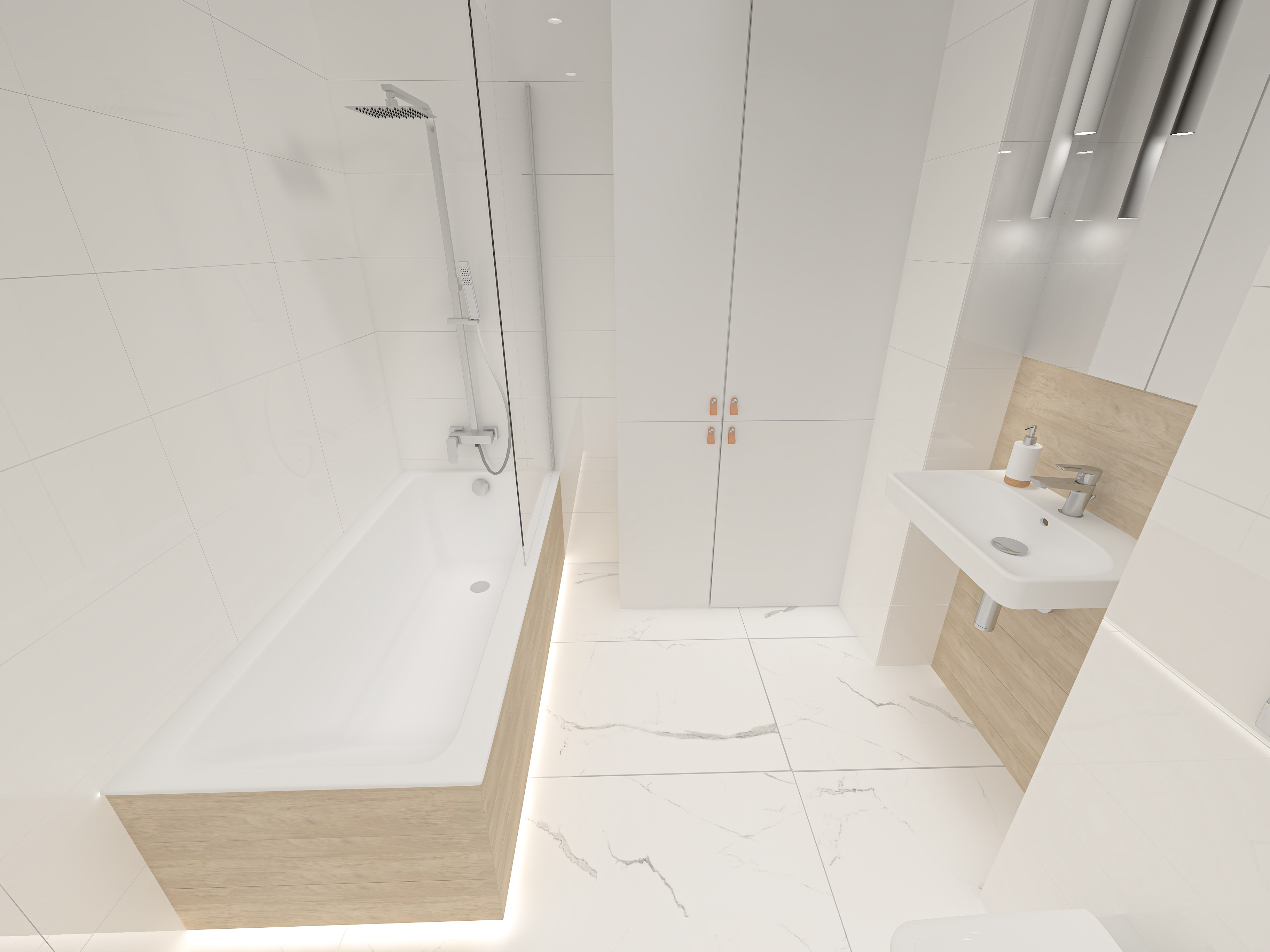 Temat łazienki był bardziej sprecyzowany przez właścicieli mieszkania. Miało być jasno i przytulnie. Dzięki zastosowaniu bieli łazienka wydaje się być większa. Dla ocieplenia obudowa wanny oraz miejsce za umywalką będzie wyłożone jasnymi drewnopodobnymi płytkami. Żeby łazienka była bardziej funkcjonalna na wannie będzie parawan, dzięki czemu wanna będzie pełniła również funkcję prysznica. Na wprost wejścia znajduje się zabudowa, w której ukryty jest piec gazowy oraz pralka. Dodatkowo zabudowa jest powiększona o miejsce do przechowywania. W tej łazience dużą rolę odgrywa również oświetlenie. Oprócz oprawek w podwieszonym suficie zaproponowałam oświetlenie led pod wanną oraz dwie ozdobne, wiszące lampy, znajdujące się przy lustrze. Na wizualizacji wygląda to tak: